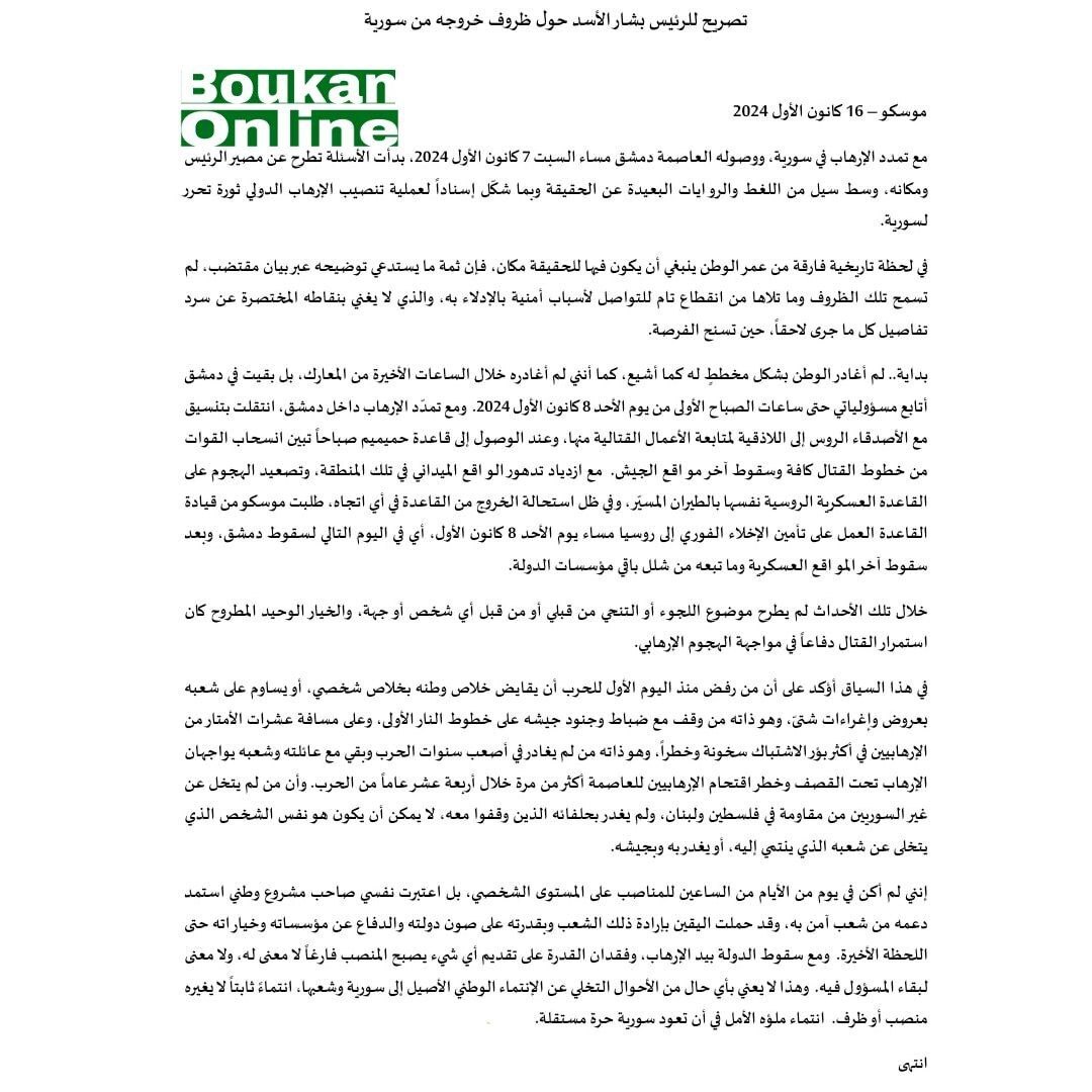 بیانیه بشار اسد رئیس جمهور سابق سوریه درباره شرایط خروجش از سوریه