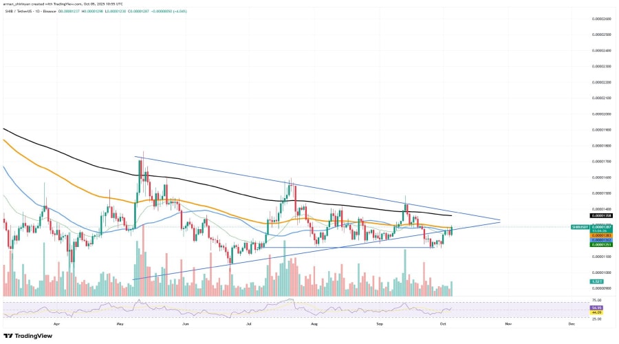در بازه روزانه، حجم معاملات به طور قابلتوجهی افزایش یافته و تلاش خریداران نیز برای عبور از میانگین متحرک نمایی ۱۰۰ روزه بیشتر شده است. این سطح در گذشته بهعنوان مقاومت عمل کرده بود، اما روند اخیر نشان میدهد که خریداران دوباره قدرت خود را بازیافتهاند. قیمت SHIB اخیراً از خط روند صعودی خود بازگشته و به سمت محدوده ۰.۰۰۰۰۱۳۵ دلار حرکت کرده است؛ جایی که با مرز بالایی الگوی مثلث متقارن و میانگین متحرک نمایی ۱۰۰ روزه همراستا است.