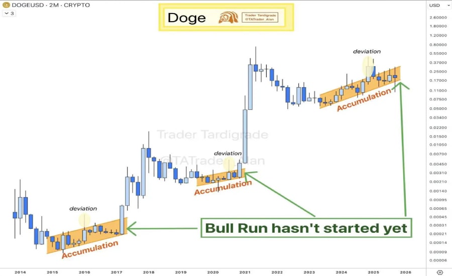این تحول میتواند عرضه در گردش دوجکوین را کاهش دهد و همزمان باعث افزایش مشارکت سرمایهگذاران نهادی شود؛ عاملی که بسیاری از تحلیلگران آن را زمینهساز جهش احتمالی قیمت DOGE تا مرز ۱ دلار میدانند. یکی از تحلیلگران معروف کریپتو با نام تریدر تاردیگرید (Trader Tardigrade) نیز تأکید کرده که روند صعودی دوجکوین هنوز آغاز نشده و این ارز دیجیتال پتانسیل رشد چشمگیری در پیش دارد.