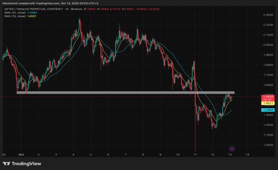 بر اساس دادههای بازار، قیمت ASTER طی اصلاح گسترده اخیر بازار از بالای ۱.۷۰ دلار به ۱.۱۵ دلار سقوط کرد، ولی اکنون در محدوده ۱.۴۵–۱.۵۰ دلار تثبیت شده است. تحلیلگران تکنیکال میگویند عبور قیمت از ۱.۶۰–۱.۶۵ دلار میتواند روند بازگشتی قدرتمندتری را تأیید کند.