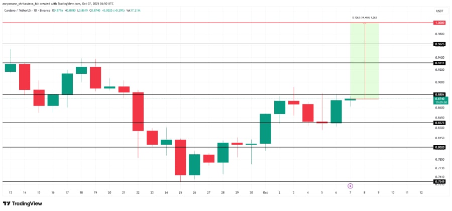 از سوی دیگر، شاخص قدرت نسبی (RSI) روند صعودی کوتاهمدتی را آغاز کرده و از محدوده خنثی به صعودی در حال حرکت است. این نشانه تکنیکال میتواند در صورت تداوم، پیشدرآمدی برای رشد احتمالی ADA باشد.